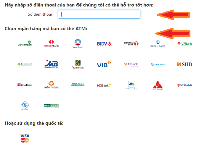 BƯỚC 6: Nhập số điện thoại và chọn thẻ ngân hàng (Ví dụ: Vietcombank, Agribank, VPBank, ... hoặc Visa, Master Card)