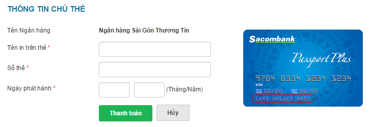 Chú ý: Để thanh toán được qua thẻ ATM hoặc thẻ Vía/Master Card, tài khoản ngân hàng của Quý khách phải được phép thanh toán online (dịch vụ InternetBanking).